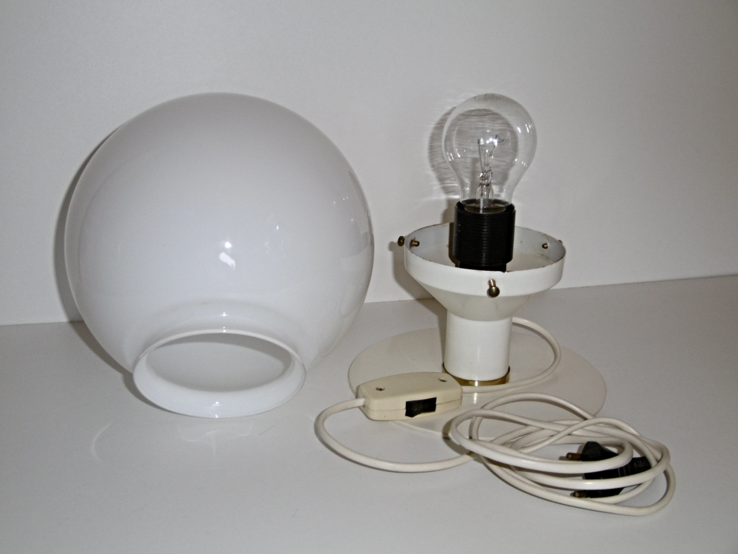 To nebude ona, je to asi opravdu ta na kouli. Jinak to nahoře vypadá na plochý šroubek s podložkou. Budova se má někdy v budoucnu rekonstruovat a upravit, tak si počkám a asi se zeptám dělníků, jestli si světla mohu vzít a doma si je opravím. Žádné vzhledově podobné svítidlo jsem nenašel kromě toho stolního výše.