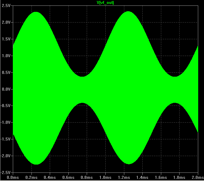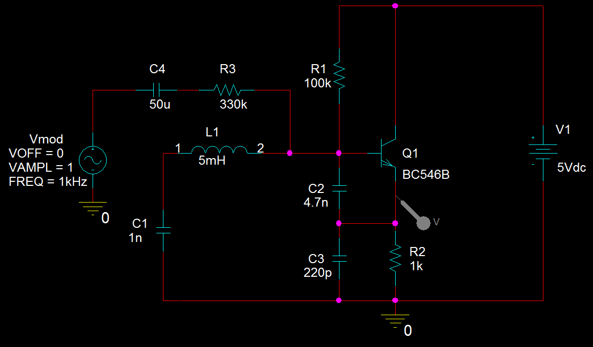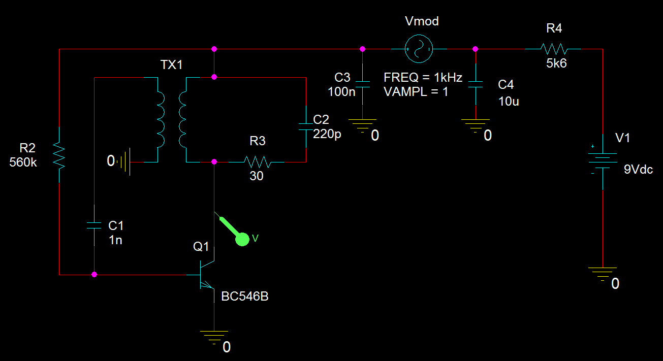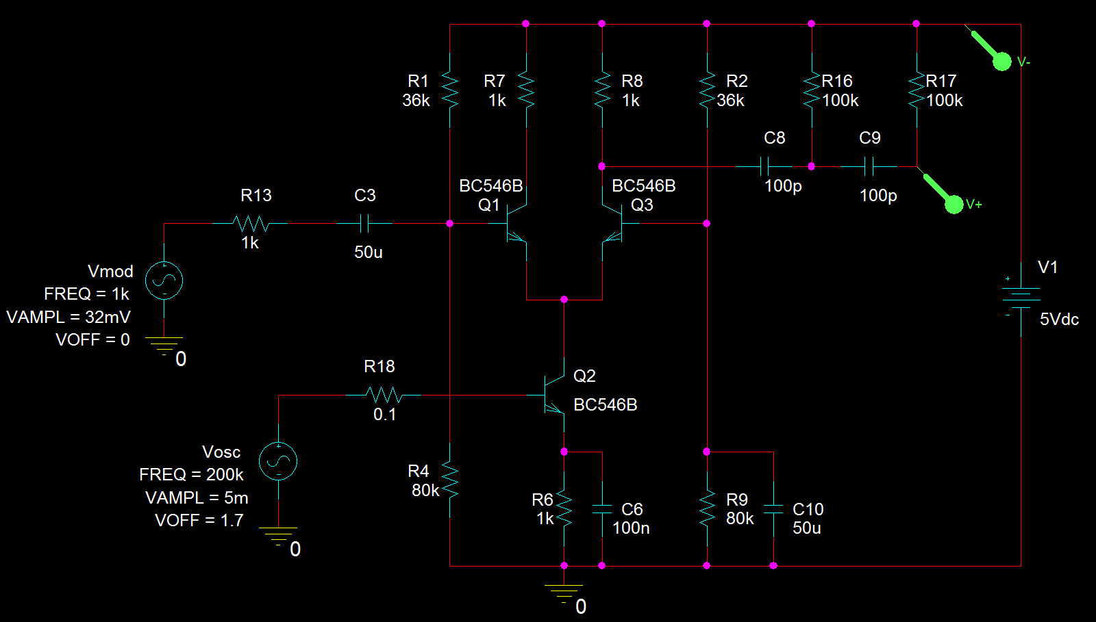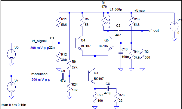 Okopíroval som to do detailu, ale po AM modulácii tam nebolo ani stopy. Neviem, ako pani mohla dostať na výstupe moduláciu. Vyhodnotil som to tak, že si upravila model toho tranzistora na nelineárny. Potom som sa inšpiroval modulátorom od Tauša (Pokusy z radiotechniky) a ešte som skúsil modulovať Colpittsov oscilátor. Všetko s nulovým výsledkom, iba superpozícia bez modulácie. Je to preto, že modely tranzistorov su zrejme lineárne. Takže aditívne metódy modulácie odsimulovať neviem a neviem ani vhodne upraviť model tranzistora.