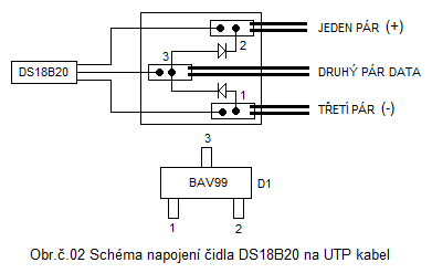 Propojení destičky čidla DS18B20 a modulu teploměru je kabelem UTP CAT 5 vodiče v páru jsou vždy spojeny (sletovány) tak že jeden pár napájí kladným napětím druhý pár napájí záporným napětím a třetí pár přenáší data z čidla DS18B20. Takto spojené páry jsou na straně čidla přiletovány na destičku DPS a na straně DPS teploměru jsou vodiče zakončeny v konektoru pro připojení do konektoru JP3 (v tomto případě je délka UTP kabelu 20M). Pokud bude propojení čidla DS18B20 a elektroniky na větší vzdálenost bude v případě výpadků komunikace nutno snížit hodnotu rezistoru R8 na hodnotu 3K3 nebo nižší toto je nutné odzkoušet.
