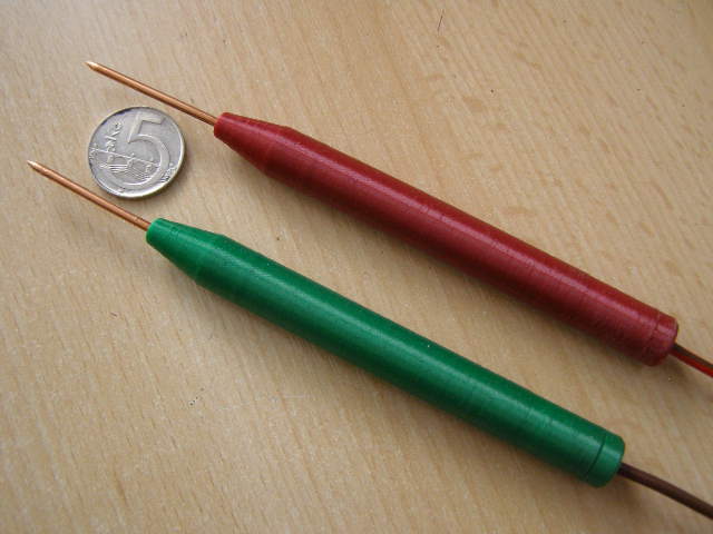 Čas od času potřebuji prohnat přes měřící šňůry po delší dobu proud okolo 10A. Vytisknul jsem si měřící hroty 12x110 a sílou stěny cca 2mm. (tisk s límcem, na vejšku)To jen tak nepraskne. Licna 2,5mm2 a mosazný banánek s fosforbronzovou planžetou ze starých dob. Taková blbost ale nezradí. Náklady minimální. Kdyby se to někomu hodilo, pošlu tiskové xxxx.stl.