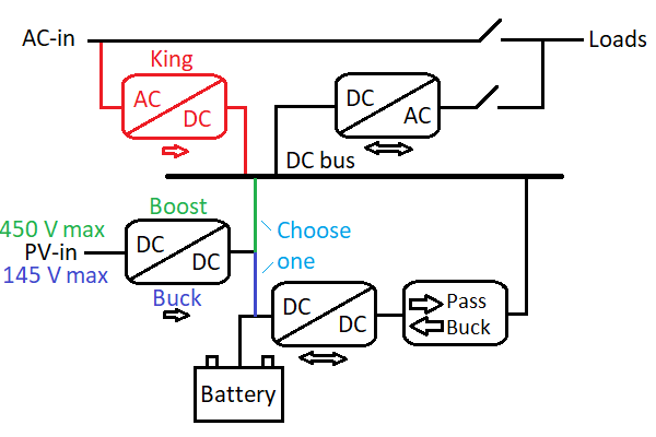 King pouziva konverziu AC - DC (medziobvod) DC - AC - teda prepnutie je bez vypadku, akurat pri prevadzke je tam horsia ucinnost - kvoli dovjitej konverzii. Ale to sa da riesit napr ak viem ze bude par dni hnusne tak to prepnut do ECO modu kde sa zopne bypass rele.