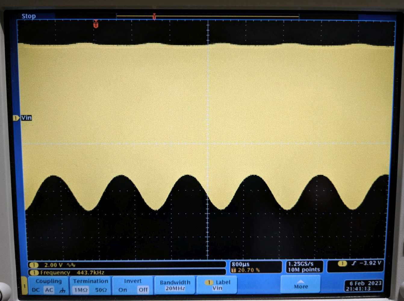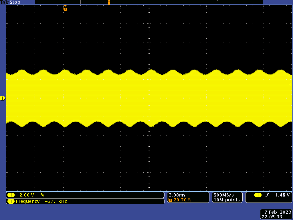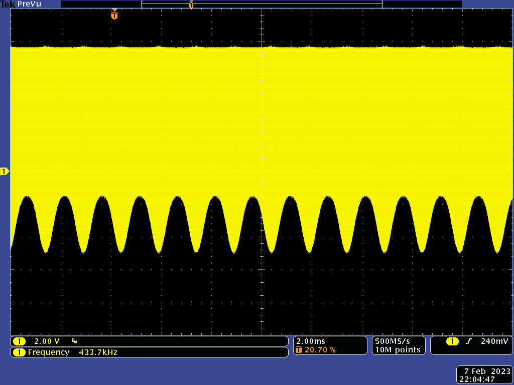 Prvý priebeh je meraný priamo na kolektore oscilátora. Druhý po odfiltrovaní NF zložky. Je to najväčšia neskreslená hĺbka modulácie, akú tento obvod dokáže dosiahnuť. Chcelo by to zvýšiť prúdové zosilnenie budiča.