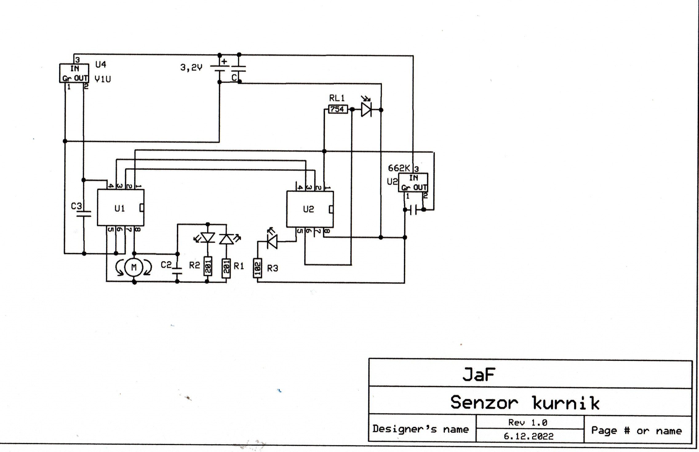 Ahoj všichni, prosím o radu. Dvířka kurníku otevírá motorek, který ovládá světelný senzor s fototranzistorem. Při setmění se točí vpravo cca 6 vt. a po rozednění vlevo cca 6 vt. Nyní přestal fungovat. Rozkreslil jsem schema, ale bohužel na U1 a U2 není žádné značení. Nemáte někdo „potuchy“ co by to mohlo být za komponenty. Fototranzistor reaguje na změnu světla, tak si myslím, že závada bude právě buď v U1 nebo U2. Děkuji všem za odpovědi.