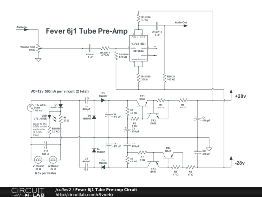Ty elektronky jsou napájené zdvojovačem, kterej vyrábí cca 28V? Schéma je snad zhruba toto. https://www.circuitlab.com/circuit/9vnehk/fever-6j1-tube-pre-amp-circuit/