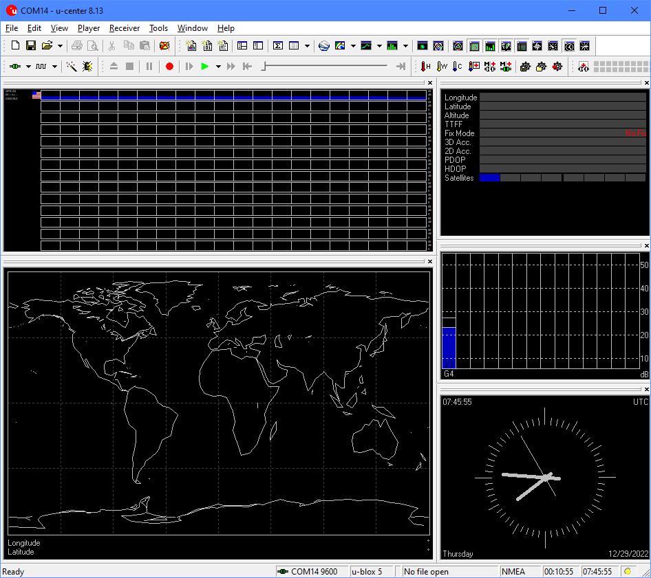Nainstaloval jsem U-center 22 a zkusil ho s tím Arduiňáckým USB převodníkem na RX a TX 3,3V. A nechal tam valit texty, co šly z Arduina přes USB na displej PC. V U-centeru se objevil COM4, je vidět, že v jednosekundových intervalech ikona komunikace problikává ale v žádným View se nic nezobrazuje. Zkusím to přepojit napřímo bez Arduina.