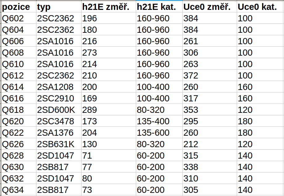 Doplňující otázka: podle označení UCE0 ty tranzistory byly měřené vypájené a "s bází v luftě"? Nebo byly testované s nějakým odporem mezi bází a emitorem? Pak by tam totiž musel být uvedený konkrétní odpor a průrazné napětí jako UCER. V tom případě by mě ty hodnoty neudivily, přinejmenším nijak zvlášť.
