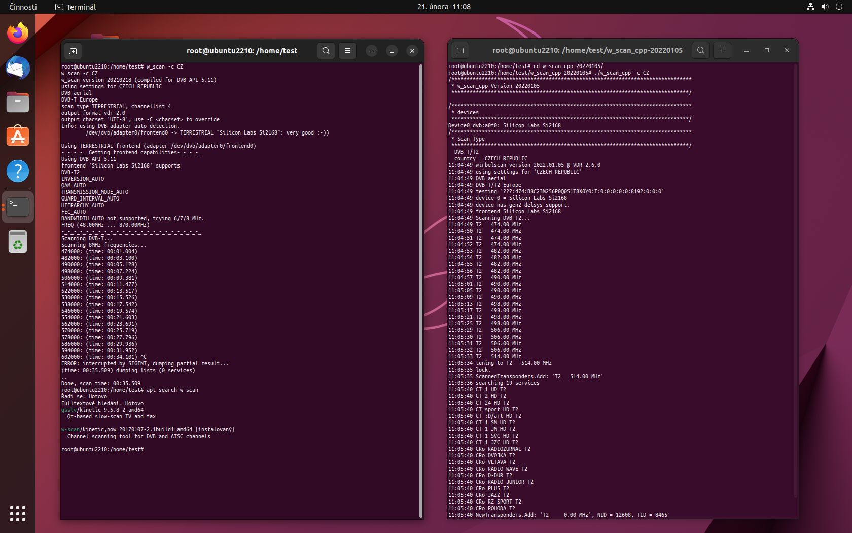 V Ubuntu 22.10 je v repozitáři w_scan z roku 2017 a jak jsem psal, tak DVB-T2 skenovat neumí viz. levé okno, až w_scan_cpp ho umí viz. pravé okno. Jenže w_scan_cpp se musí zkompilovat za pomoci ostatních balíků a souborů třetích stran viz. předchozí odkaz.