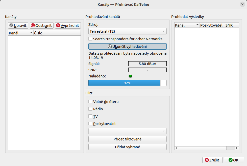 Ještě to doplním, protože mi to nedalo. Pokud ve zdroji pro DVB-T vyberu cz-All, tak Kaffeine nenaladí nic, když vyberu Automatické prohledávání, tak najde vše. Až kolem 70% začne ladit frekvence od 21 kanálu výš.