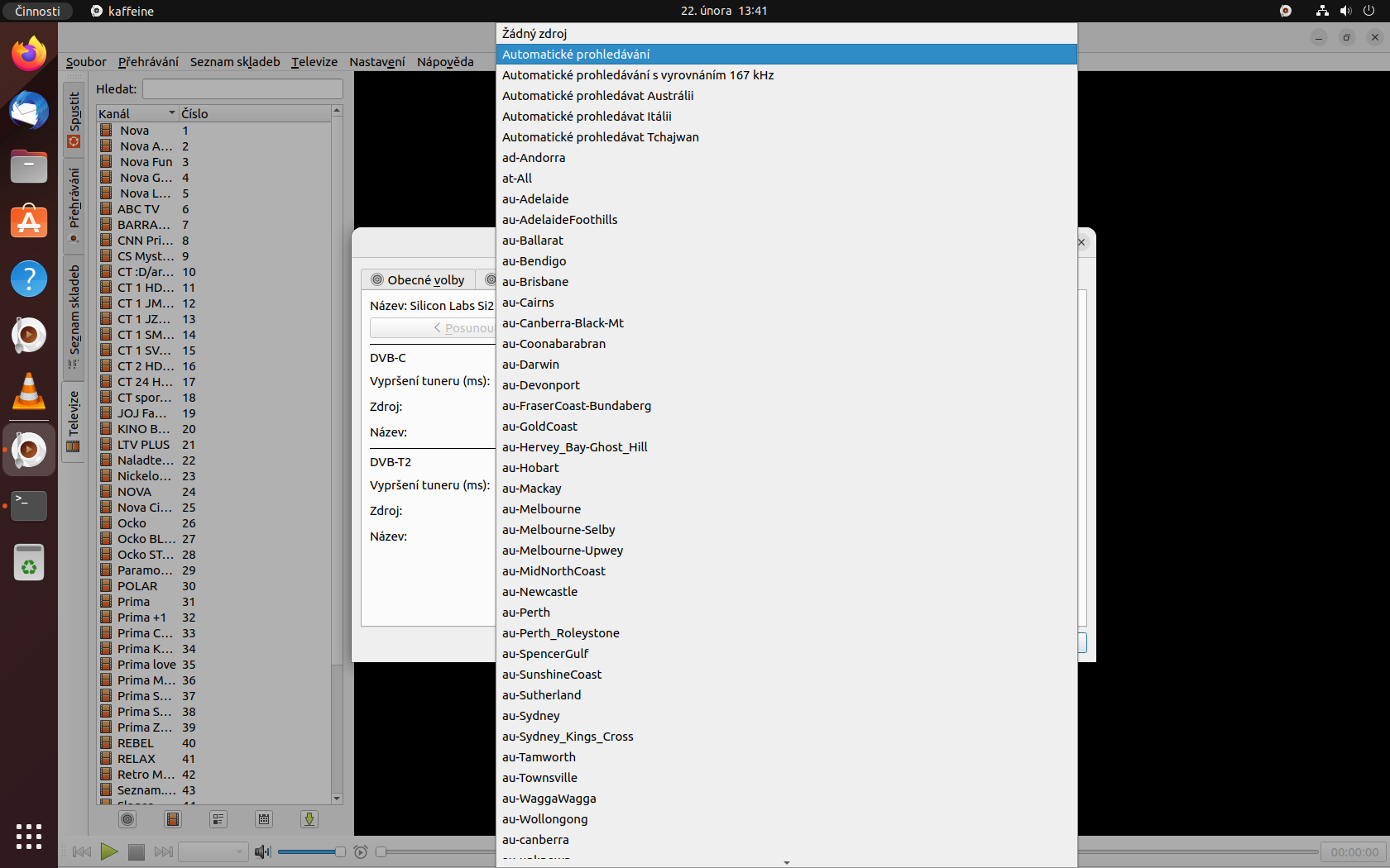 Tak jsem dorazil dříve a zjistil, že mě Kaffeine taky blbne a vůbec nic nenaladí, takže jsem naskenoval multiplexy s w_scan_cpp a jdou přehrát přes VLC.