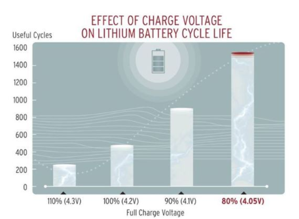 Našiel som graf v prílohe, ktorý rieši vzťah medzi napätím na ktoré batérie nabíjam a počtom cyklov.