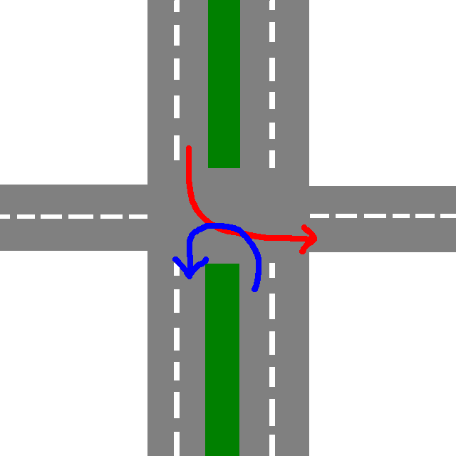 Však toto je snad triviální věc. Co bys jako očekával od řidičů, kteří oba blikají vlevo a zabočují doleva a míjejí se vpravo a nikdo jiný tam nejede? To, že jeden z nich ještě nakonec zabočí ještě víc a druhý si zapálí cigaretu, tak s tím nemá nic společného. Pokud to není světly řízená křižovatka, tak se tam otáčet do těch pruhů v protisměru snad může.