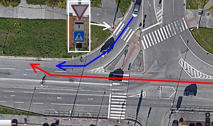 PoPalo -:jo, tohle je trochu záludný. Ale když ten modrý už projel křižovatku, tak už je na hlavní, ten červený by se podle toho měl chovat.