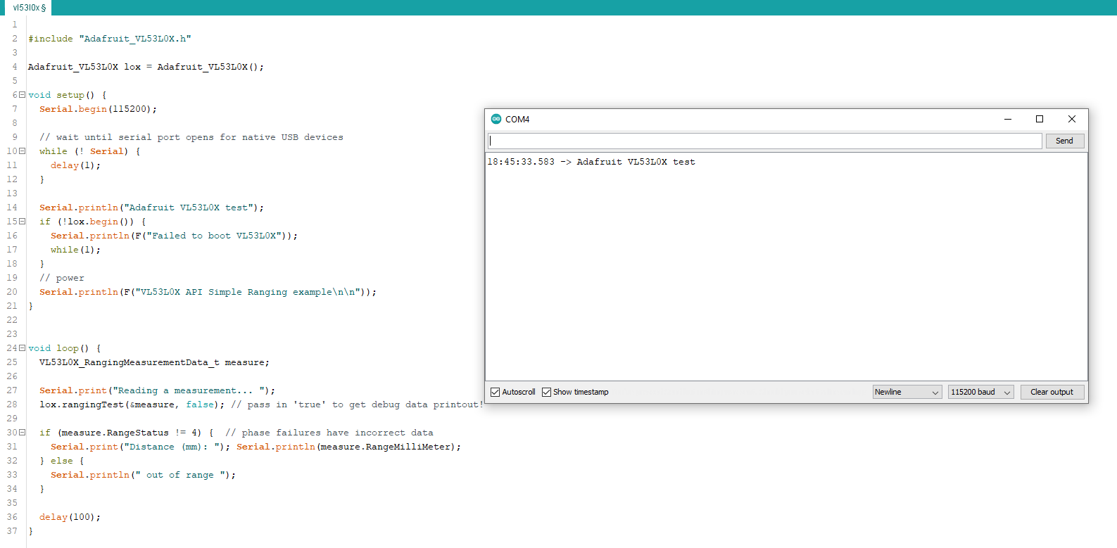 Zdravím, zkouším měřit vzdálenost s ToF senzorem VL53L0X, ale nedaří se mi to. S arduinem bych chtěl komunikovat přes I2C výstupy senzoru, nicméně po připojení a nahrání programu (již připraveného v knihovně to napíše pouze Adafruit VL53L0X test - viz foto) a dál už nic. Nevíte co s tím? Děkuji.
