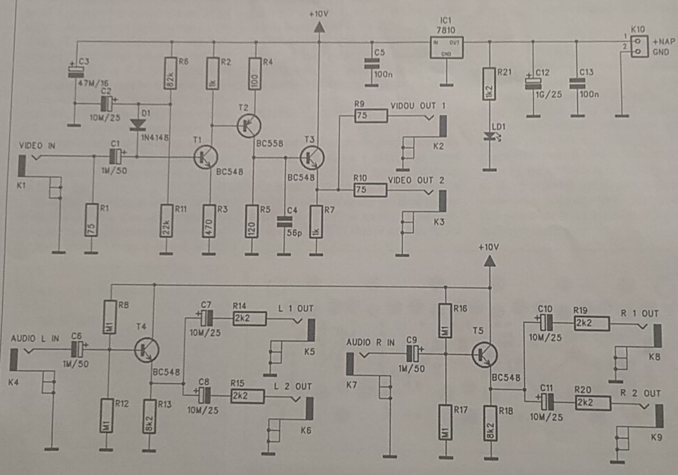 A k tomu aktivnímu rozbočovači, co je tu na něj schéma: trimr na nastavení pracovního bodu se hodí k nastavení, aby to neořezávalo ani synchronizační impulsy, ani bílou, a pak se dá nahradit pevnými odpory. Zesílení je potřeba jediné - a to 2x. Rozsah nastavení od 1,97 do 14,5 je nesmyslně velký, úplně stačí nahradit ten trimr ve zpětné vazbě propojkou. Pro rozdělení signálu ke dvěma vstupům to naprosto stačí.