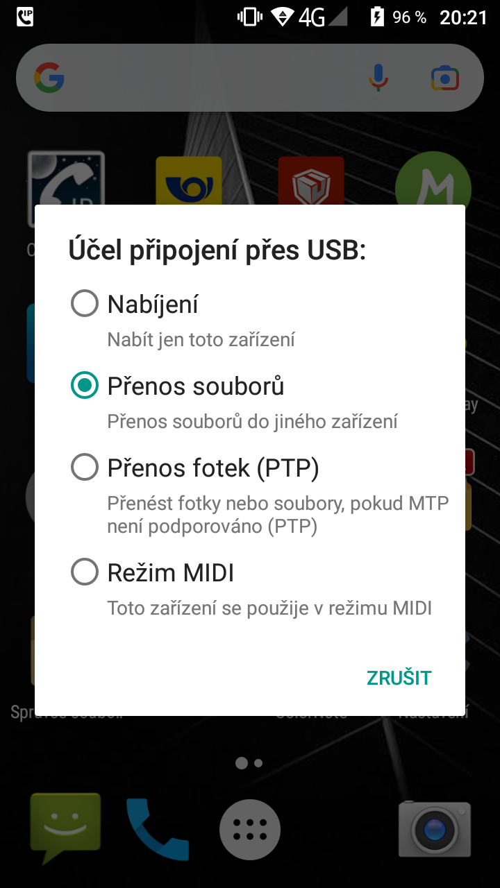 U toho mobilu pro nastavení usb se táhne z poloviny obrazovky dolů kdykoliv.