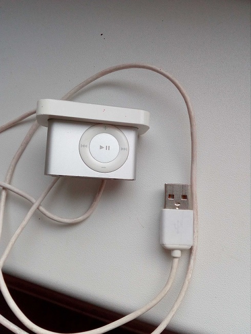 Je to iPod Shuffle 2. generacie. Nema to Lightning konektor, len 4-pinovy jack, ktory sa pouziva na pripojenie sluchadiel aj USB (cez ten stojan - dock, ale existuje aj samostatny kabel USB-jack). Bez iTunes (alebo nejakej jeho nahrady) tam hudbu nedas.