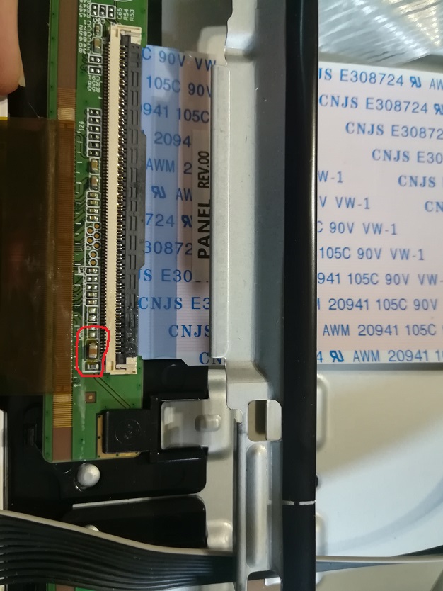 Tak TV už ožila Very Happy U konektoru napájení ze zdroje byl přerušen-řeknu rezistor, na obrázku označen žlutou šipkou - ale protože měl nulovou hodnotu a na sobě pouze označení Y, nevím, čím ho nahradit! To, že má nulový odpor, jsem zjistil podle stejného, naletovaného kousek vedle. Zkusmo jsem osadil rezistor s nulovou hodnotou a TV funguje.