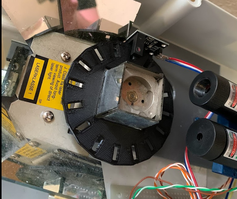 Zatím jenom zkouší napočítat těch 16 otvorů, co má na tom 3D printed kole, ale jelikož mu tam stejně chybí alespoň kontrolní otvor na celou otáčku + čidlo, nebo něco na těch rotujících zrcátkách, tak to stejně nebude mít jak zkontrolovat (teoreticky by mohl mít hallovu sondu na té desce motoru zespodu, ale nevím). To by ale nevadilo, mě by spíš zajímalo jak vydedukoval, že má na optickém čidle zákmity.