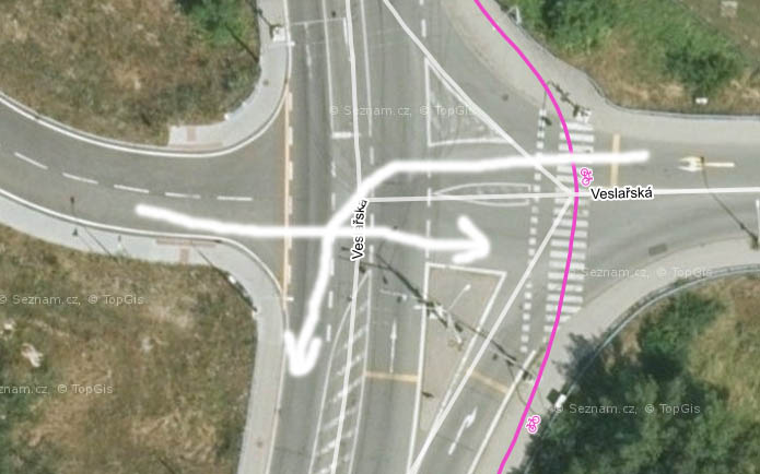Na této křižovatce jsem jel po Veslařské zprava, na semaforu doleva dolů zase na Veslařskou. A vjel mi do cesty nějakej vůl z té slepé ze zákazu vjezdu. Chtěl jet rovně na Veslařskou. Ovšem on má z jeho strany značku dej přednost v jízdě a na semafory vůbec nevidí, z jeho strany prostě nejsou. Předpokládám, že jsem byl v právu, když jsem očekával od něj přednost. On musí dát přednost všem, protože nemůže tušit kdo má kde jako barvu a kterej směr jede.
