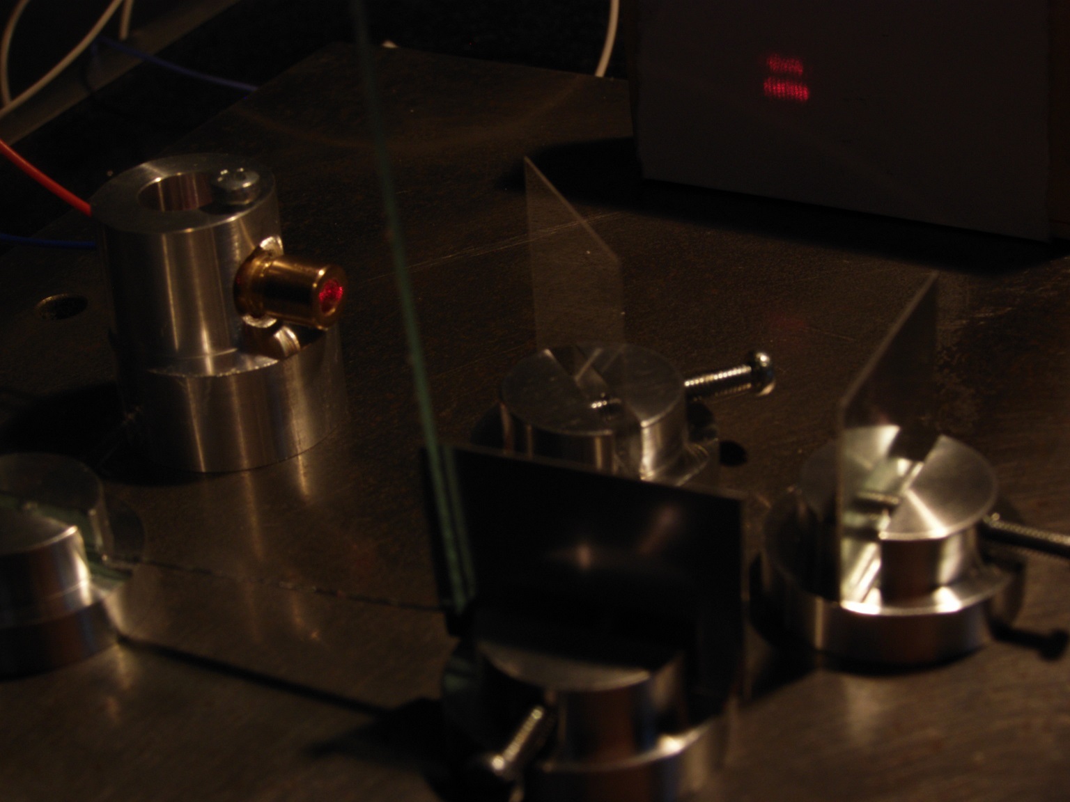 Než se rozepíšu o podrobnostech, dávám do fóra fotografii modelu mého inerferometru. Zdrojem světla je laser z Číny v přepočtu za 4 Kč. Dalším rovněž relativně drahým dílem je mikroskopické sklíčko.