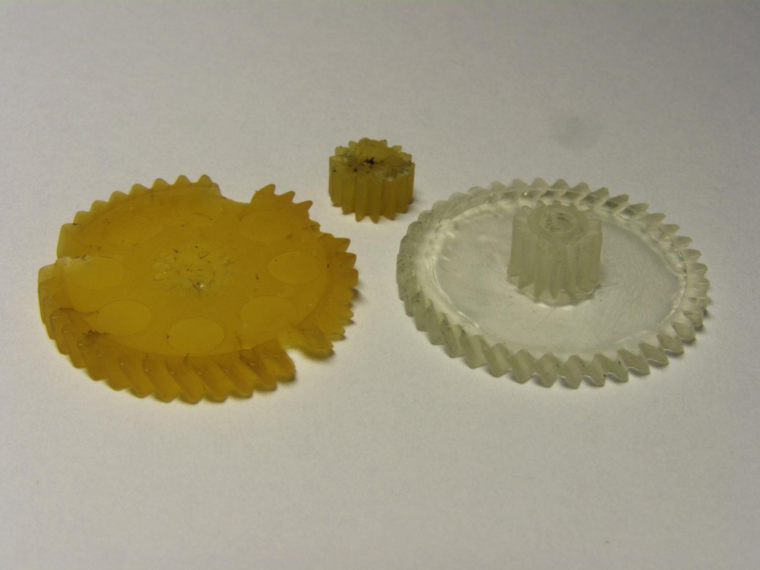 Přidávám pro ilustraci fotografii náhradního zubatého kolečka do magnetofonu Grundig CR100. Je odlité z Epoxy 1200 přes silikonovou formu, ale měl jsem tady jen dvousložkový zalévací silikon, k tomuto účelu ne moc vhodný, měkký a křehký. Forma vznikla postupným přiodléváním zbytků původního kolečka. Pro odlévání do silikonu jsem formu s epoxidem dvakrát ohřál v peci, aby nebyl viskózní, v exsikátoru jsem z něj vysál bublinky a zavzdušněním jsem jej natlačil do formy. Hladina je zabroušená do roviny. Myslím si, že s vhodnějším silikonem by mohla vzniknout použitelná čočka.