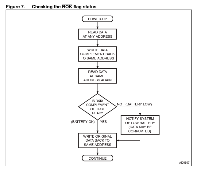 Spínací obvod napájení připojí externí VCC k RAM a odpojí baterii, když VCC stoupne nad VSO. Když VCC stoupá, kontroluje se napětí baterie. Pokud je napětí příliš nízké, bude nastaven interní příznak Battery Not OK (BOK). Příznak BOK lze zkontrolovat po zapnutí. Pokud je nastaven příznak BOK, první pokus o ZÁPIS bude zablokován. Příznak se automaticky vymaže po prvním ZÁPISU a obnoví se normální provoz RAM. Obrázek 7 na straně 11 ukazuje, jak by mohla být strukturována rutina kontroly BOK.