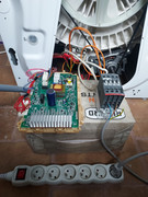 Keďže mám práčku na chalupe v miestnosti kde ju môžem prevádzkovať aj odkrytú so živými časťami vonku, tak ju ešte testujem bez zapojeného ochranného vodiča na špirále. Z dosky RJ riadim na miesto výhrevnej špirály 230V cievku výkonového stýkača a ten až následne cez 2 kontakty dáva zo zásuvky 230V na nechránenú špirálu viď. foto. Opral som pár várok prádla a s takýmto zapojením to ide bez problémov.