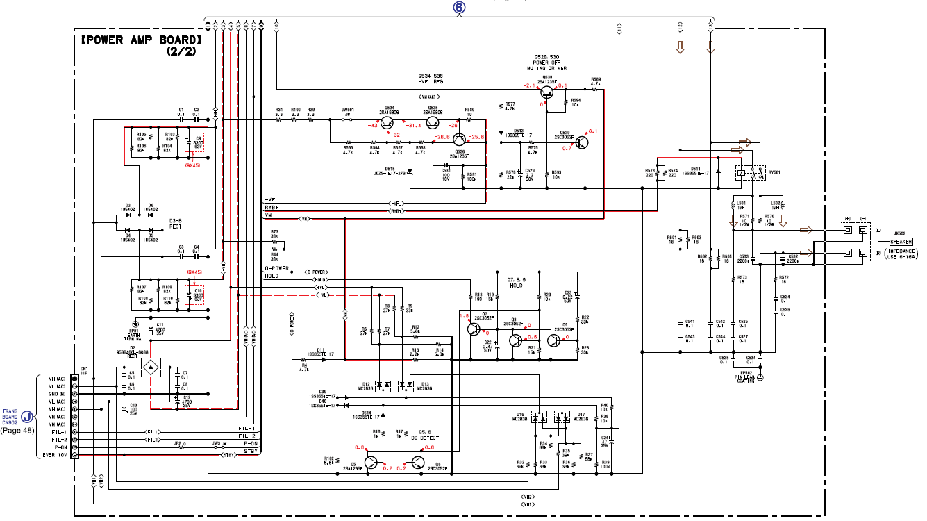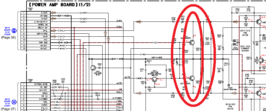 Vzal bych to z emitorů "mutovacích" tranzistorů, označení je kvůli mizernýmu rozlišení komprimovanýho obrázku nečitelný, ale jsou to ty dva co jsem červeně orámoval na mnou upraveným schématu. A určitě oddělit kondíkama a za kondíky posadit operák zapojenej jako sledovač, postačí TL072 - tím se docítí toho, že další připojený obvody nebudou mít měřitelnej vliv na signál vstupující dáldo koncovýho zešilovače.