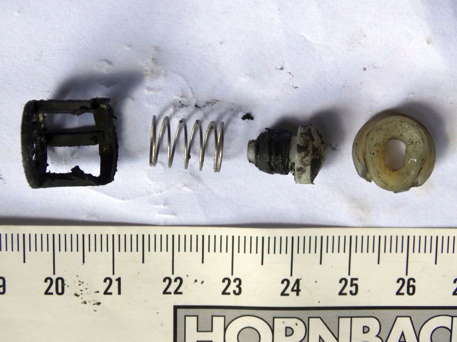 Tady je fotka jednoho ze tří poškozených ventilků. Je rozšmelcovaný plastový koš, ve kterém je uložena pružinka s vlastním ventilkem.
