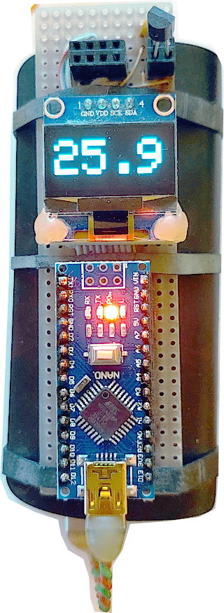 Našel jsem a zkouším dvě konstrukce s Arduinem pro DS18B20 a OLED display s řadičem SSD1306. Tady je první, zde je prakticky identická druhá (pouze s I2C adresou 0x3D se po zapnutí vůbec nic neděje, po opravě na 0x3C to cosi dělá).