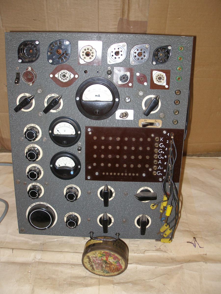je to měřič elektronek domácí výroby. Kolem roku 1950. Přidávám nějaké foto. Něco s oscilátorem tam je, ale proč, to zatím nevím. Každopádně s tím ta černá krabička souvisí. Jinak ta chybějící elektronka je usměrnovač pro Ug1 a ta patice pro "žárovku" je dle mého stabilizátor napětí, nebo doutnavka. Je tam 135VDC na kontaktech. Ještě nebyl čas ty kabely vytrasovat.