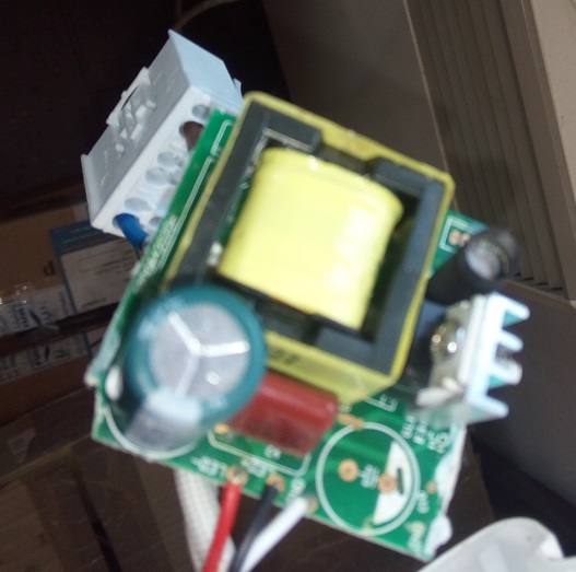 Měl, LED-pásek zapojenej ze 30 čtveřic čipů v sérii, napájení přes klasiku odpor-Graetz-filtrační kondík na 450V-driver s feritovým piditráfkem na jedný straně. Dostal jsem to od majitele autodílny, že to přestalo svítit, ať to zkusím rozchodit, ale že náhradu má a chce to zkusit, jestli to vůbec jde nebo je to neopravitelný stejně jako LEDkový světla do aut. Bylo to neopravitelný, jedna do zkratu sčoudlá čtveřice blokovala náběh driveru, přerušit to nebylo kde, vodivý dráhy v pásku byly něčím zatřený nebo jinak zakrytý, nechtěl jsem riskovat že říznu do průběžnejch napájecích vedení - tak to šlo do červenýho kontyšu ...