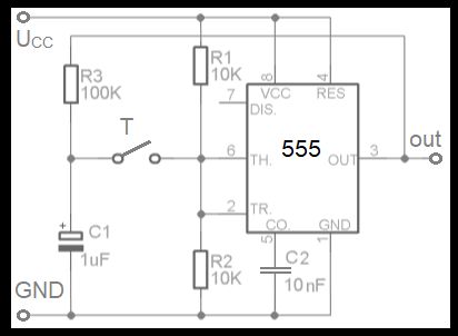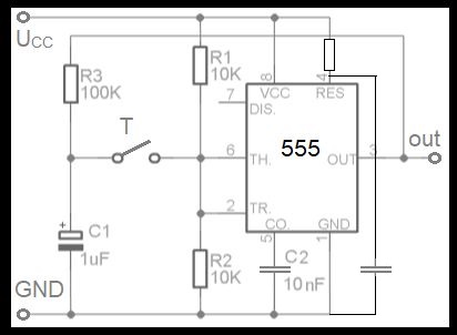 POZNÁMKA: Resetovací vstupní proud na TTL verzi 555 je velmi vysoký (mezi 0,4 mA a 1,5 mA), takže R musí být spíše malý. 100 Ohm zajistí, že úrovně budou v rámci specifikací. Dioda umožňuje rychlé vybití kondenzátoru v případě, že dojde k velmi rychlému cyklu vypnutí/zapnutí.
