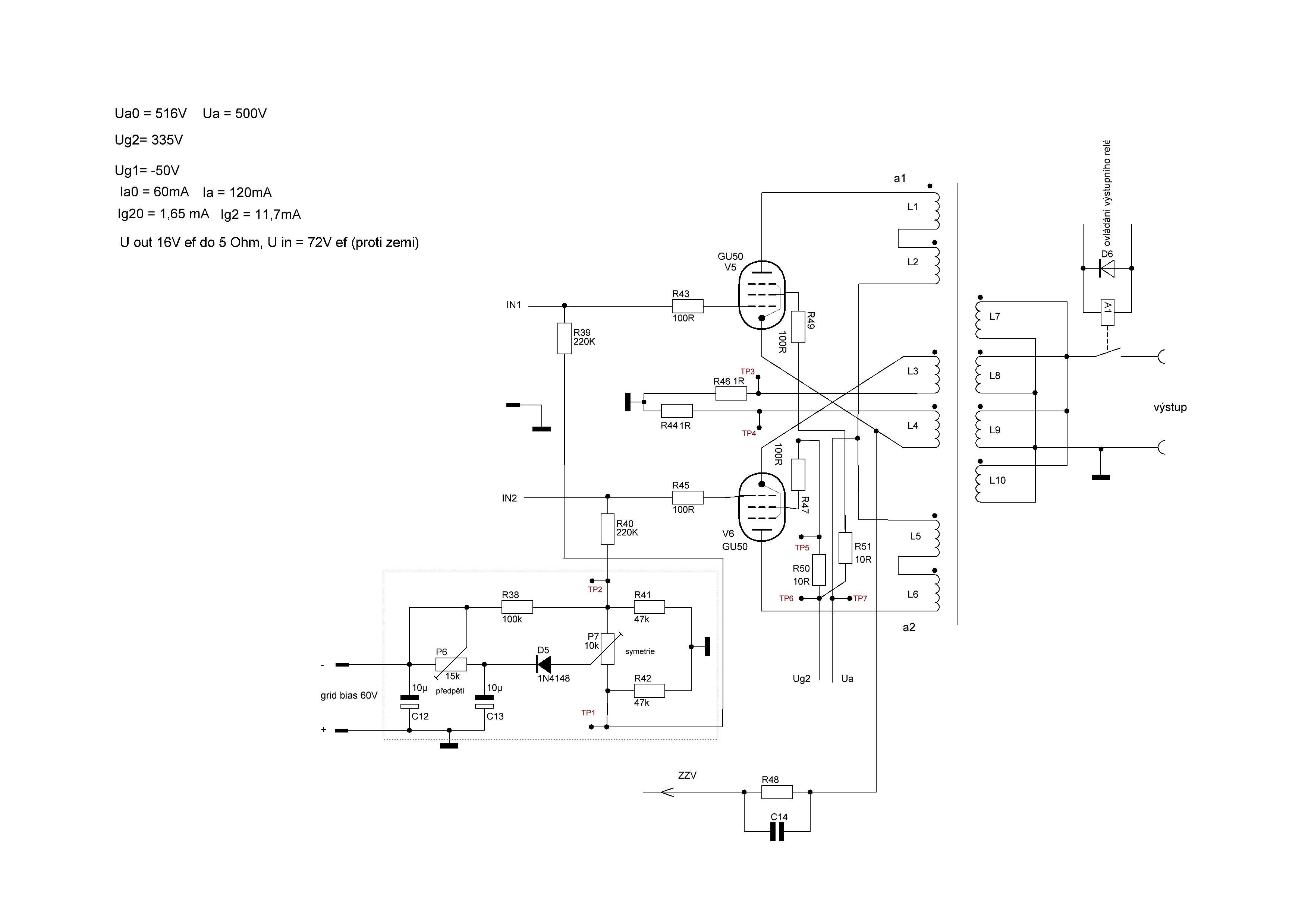 Zesilovač pracuje v AB třídě, v pentodovém modu zpětná vazba katodovým vinutím. Ug2 je pevné.