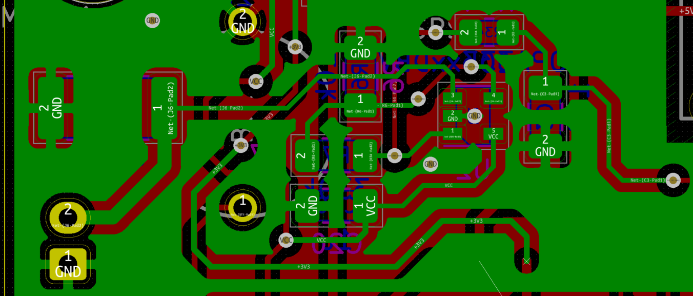 Vpravo dole ti chybí prokov na napájecím napětí, spoje jsou tuším moc tenké, pokud nemají alespoň 0.2 mm, tak výroba bývá drážší.