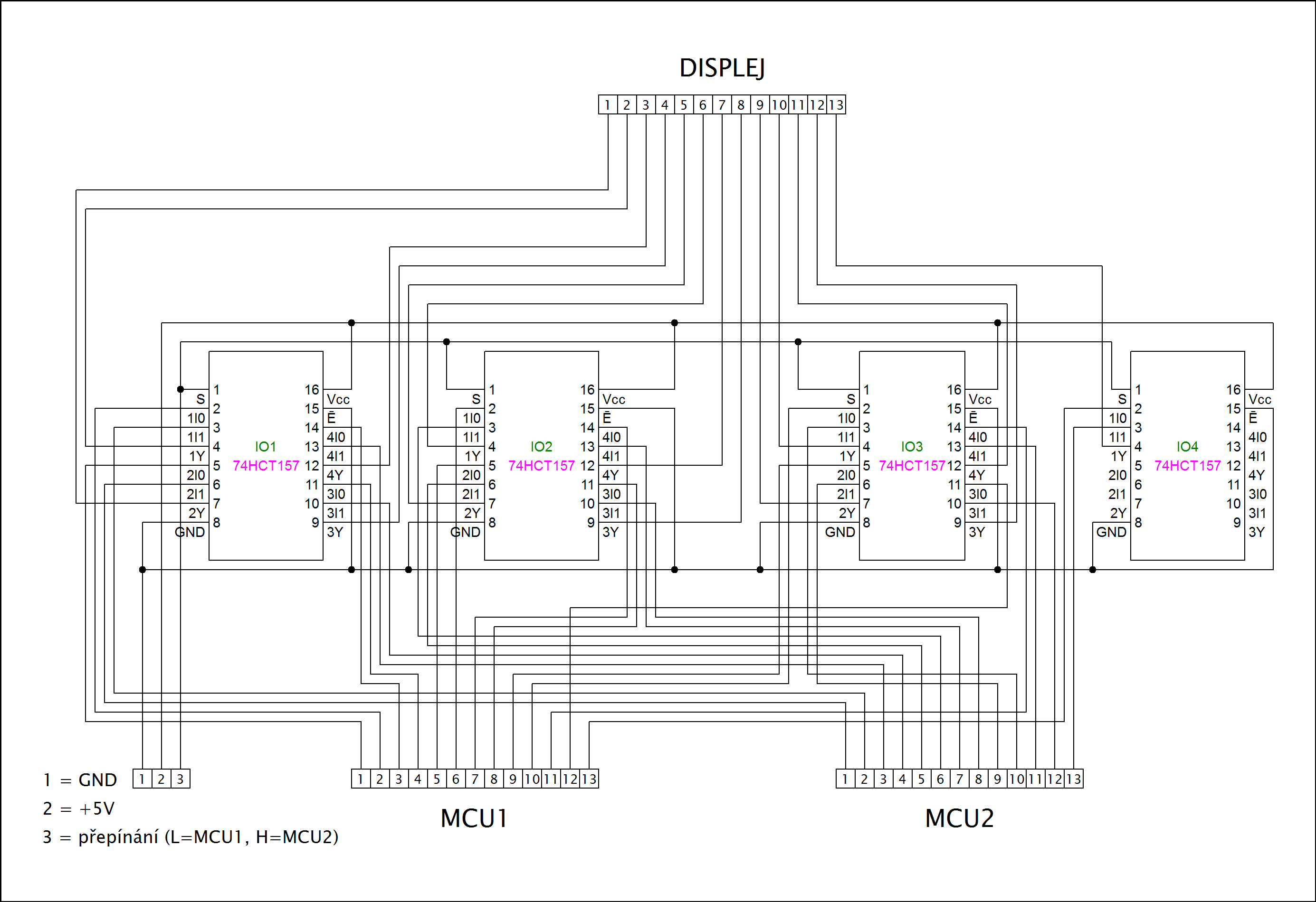 TO Vladano: Presne tak som to urobil, len som tam použil 74HC257. Ináč keď rád kreslíš ako by si zostavil riadiaci obvod na prepínanie displejov? Ideálne (3sekundy display č.1,) (0,5s impulz do E na zatemnenie)(3sekundy display č.2) a zasa zatemnenie a zasa to isté dokola.