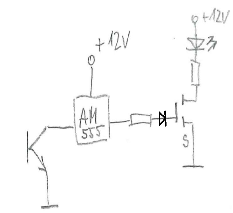 Když časovač 555 "odzemníš" nějakým přerušením přívodu k noze č.1, tak bude jeho výstup zdrojem "log.1" a ten MOSFET to otevře - takže místo blikání ta výkonová LEDka jako zátěž MOSFETu bud trvale svítit. DukeNuke potřebuje aby mu to dávalo "balíčky" krátkejch bliknutí, EN "burst". A na to bohatě stačí invertovat funkci toho otevřenýho kolektoru dalším jedním trandem a tím invertovaným signálem ovládat resetovací vstup 555 - kterej je k takovýmu účelu i přímo nakonstruovanej, běžná 555 se přivedením napětí menšího jak asi 0,5V na vývod 4 zablokuje s výstupem v "log.0" - což je přesně požadovaná funkce. Nepotečou tam žádný horentní proudy, doslova stačí dát tam NPN tranzistor s emitorem přímo na záporným přívodu a jeho kolektor na vývod č.4, do báze dát 10kΩ na (+) napájení a 1kΩ na ten otevřenej kolektor.