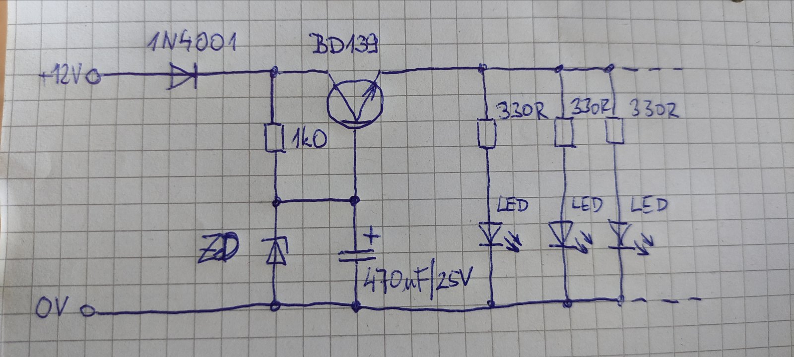 Vliv kolísání palubního napětí na svit LEDek je marginální, když běží motor, je na baterce prakticky trvale 14,5V - teda u všech rozumnejch aut, ne u těch dnešních zvrhlostí, který nejdřív nechávají baterku vydudat prakticky na minimum, než ji začnou znovu nabíjet - a nabíjet takovým proudem, že z toho dostává kopřivku. Jinak ten tvůj "kondenzátor, nejspíš elektrolitický" bych zapojil jinak - udělal bych zapojení s výkonovým tranzistorem. Ten stabilizátor tam je víceméně zbytečnej, protože se ti může stát, že LEDky budou mít v rámci výrobní tolerance o maličko vyšší prahový napětí, takže se budou rozsvěcet až od 6,09V - a stabec bude naopak na dolní toleranci a bude ti dávat 5,95V - a ty dvě LEDky přes něj plně nerozsvítíš. Radši si to zapoj podle následujícího schématu - těch LEDek si tam budeš moct dát víc, když dáš tranzistor bez chladiče, měl by v pohodě "utáhnout" 4-5ks takovejch LEDek, pro jistotu bych mu namontoval hnilíkový chladicí křidýlko nebo kousek Al plechu ohnutej do "U" - celkovej rozměr asi tak 3x3cm. S výkonnějším typem tranzistoru bys tam mohl mít klidně celej vánoční stromeček. Zenerka ZD tam pro použití v osobáku bejt nemusí, může se úplně vynechat, pokud ji tam dáš, kupuj typ na 12V - potom zapojení bude i stabilizovat napětí ze zdroje s vyšším palubním napětím, třeba z 24V v náklaďáku. Ty čárkovaný čáry doprava znamenají, že tam stejným způsobem můžeš zapojit další LEDky - a kdyby se ti zdálo, že ti s odporem 330Ω vypalujou voči, tak jim prostě zvyš ty odpory v sérii - zkoušej zvýšit na 390Ω, 470Ω, 560Ω nebo klidně i na víc, myslím že i s 1kΩ budou pořád ještě dostatečně svítit - a nebudou se uvnitř tolik hřát a dýl ti tam vydrží. Kondík v bázi tranzistoru zajistí, že jeho výstupní napětí se bude zvyšovat pomalu stejně, jak se bude nabíjet přes ten odpor 1kΩ - hodnoty na obrázku dají čas náběhu asi 0,5 sekundy., kdybys chtěl víc, dej tam 1000uF kondenzátor - nebo dva ty 470uF paralelně.