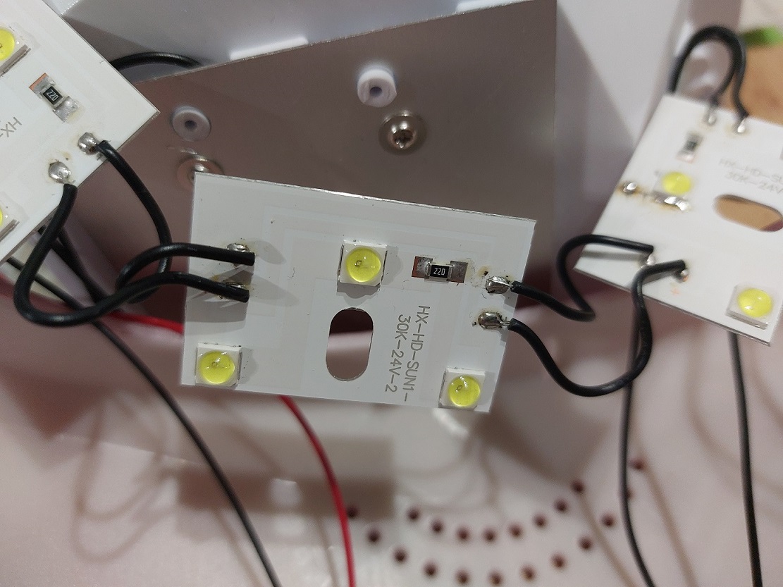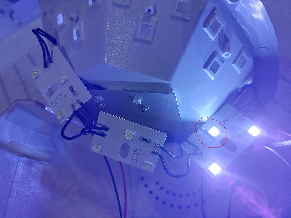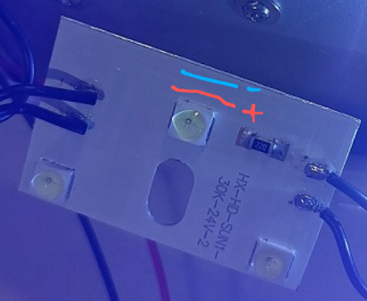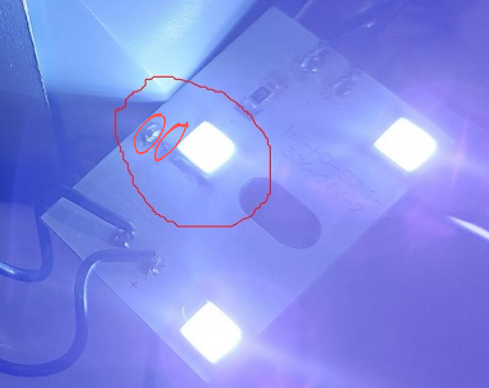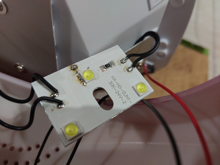EDIT: možná je zlomená deska elektroniky v první destičce nad prostřední diodou, tam vedou vedle sebe obě cesty z jednoho kraje na druhý (mínus víc na kraji a plus blíž k diodě).
