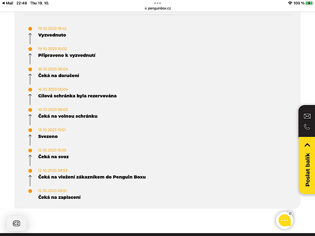 26.10. ráno jsem odeslal balík z Bydžova do Nepomuku na koncovou adresu. Hned druhý den bylo ve sledováku, že je na depu Plzeň.