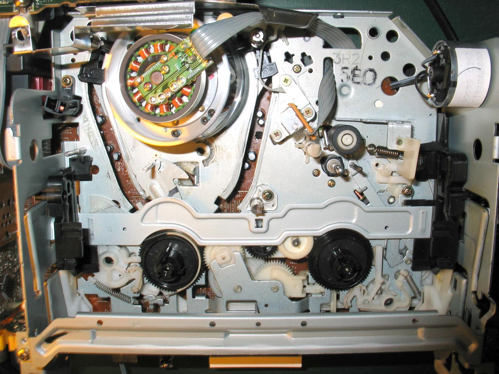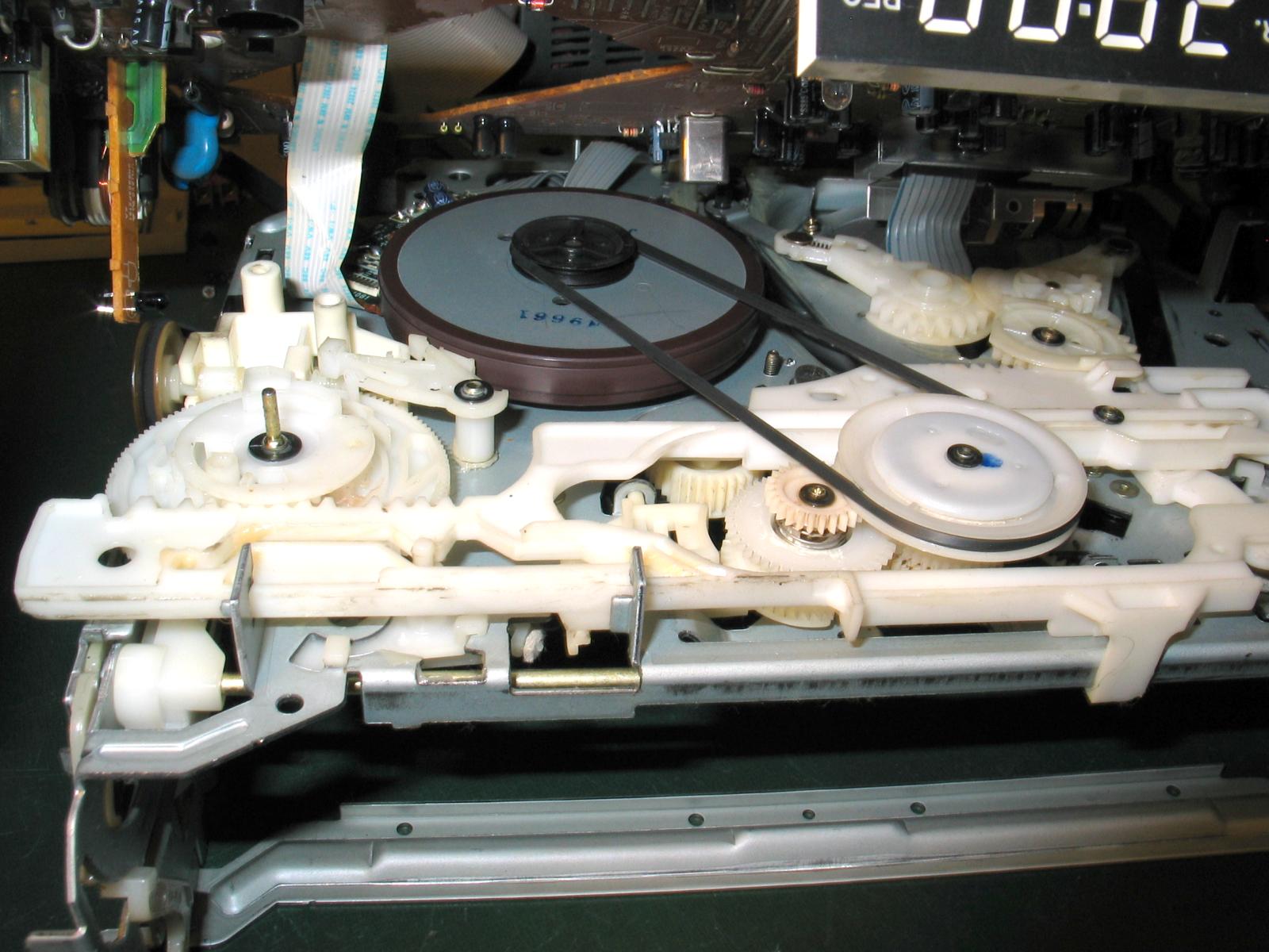 Mode switch som vybral von, rozobral a vycistil. Uz to nerobi totalne nezmysly, ale pri PLAY sa paska nehybe. Preklzuje spojkove ozubene koleso s pruzinou (na druhej fotke pri gumicke).