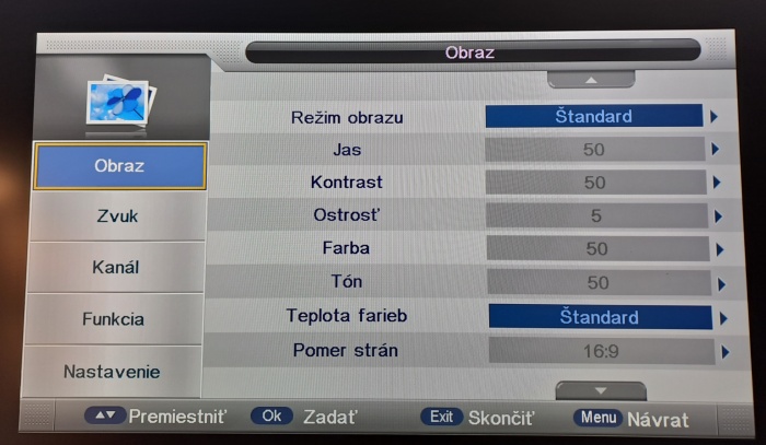 zmeň režim obrazu zo Štandart na Užívateľský. Ak nie, niektoré TV pri pripojení signálu cez VGA neumožňujú nastavovanie parametrov obrazu. Nedá sa to nastaviť ani pri prepnutí na EXT alebo iný vstup ?