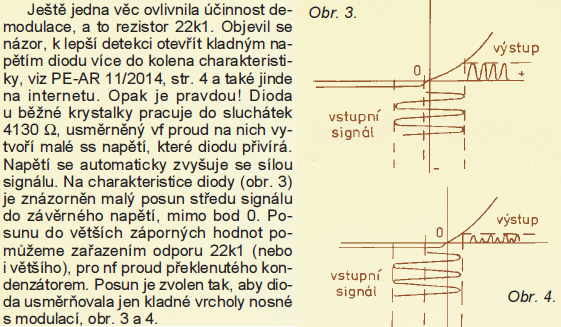 Funguje to i s bipolárem (samozřejmě FET je lepší). Vtip je v tom, že emitorový odpor musí být dostatečně velký, nebo je dobré použít zdroj proudu do emitoru (to je lepší varianta). Pokud báze tranzistoru je přímo připojena na cívku (má tedy nulový potenciál), pak je nutné použít záporný zdroj proudu pro emitor. Na rozdíl od obyčejné diody, která má "otvírací napětí" na hraně kolena, tento tranzistor je "otevřený" stále stejně při libovolné velikosti vstupního signálu. To znamená, že na něm nevzniká žádné zkreslení - je tedy velmi lineární.