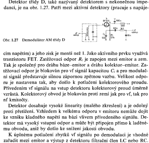 A co použít jako demodulátor AM detektor třídy D (Amatérská radiotechnika a elektronika - 3 díl, strana 49). Má velmi vysoký odpor, nezatěžuje laděný obvod (vysoká selektivita), nízké zkreslení, schopnost lineárně zpracovat i velmi slabé signály. Má zesílení 1. Nemusí se dávat na odbočku - to znamená vyšší výstupní napětí...