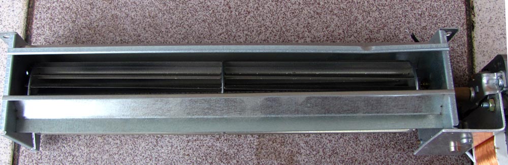 To je tangenciální ventilátor do akumulaček. Točí se obráceně než odstředivý ventilátor, lopatky tlačí vzduch dovnitř rotoru. V místě širokého výřezu ale vyvinou větší tlak než v místě úzké štěrbiny - takže vzduch tou štěrbinou odchází.