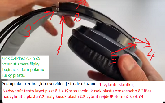 Ako rozobrat tie sluchatka je na tomto obr.popisane .Bez nadvihnutia plastu č.2,nejde vybrat kusok plastu na konci č.3!Ja som to tiez nevedel ze to tak drzi!