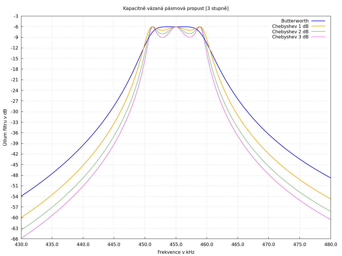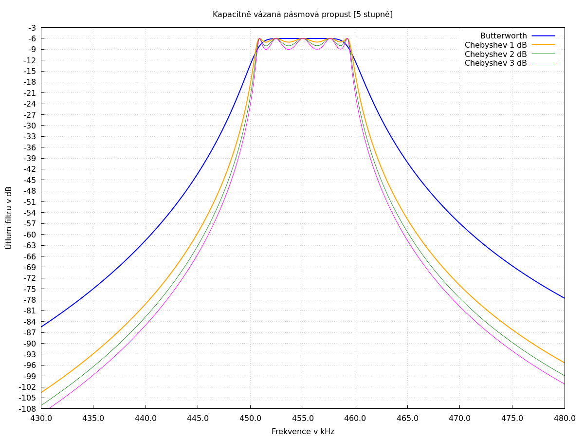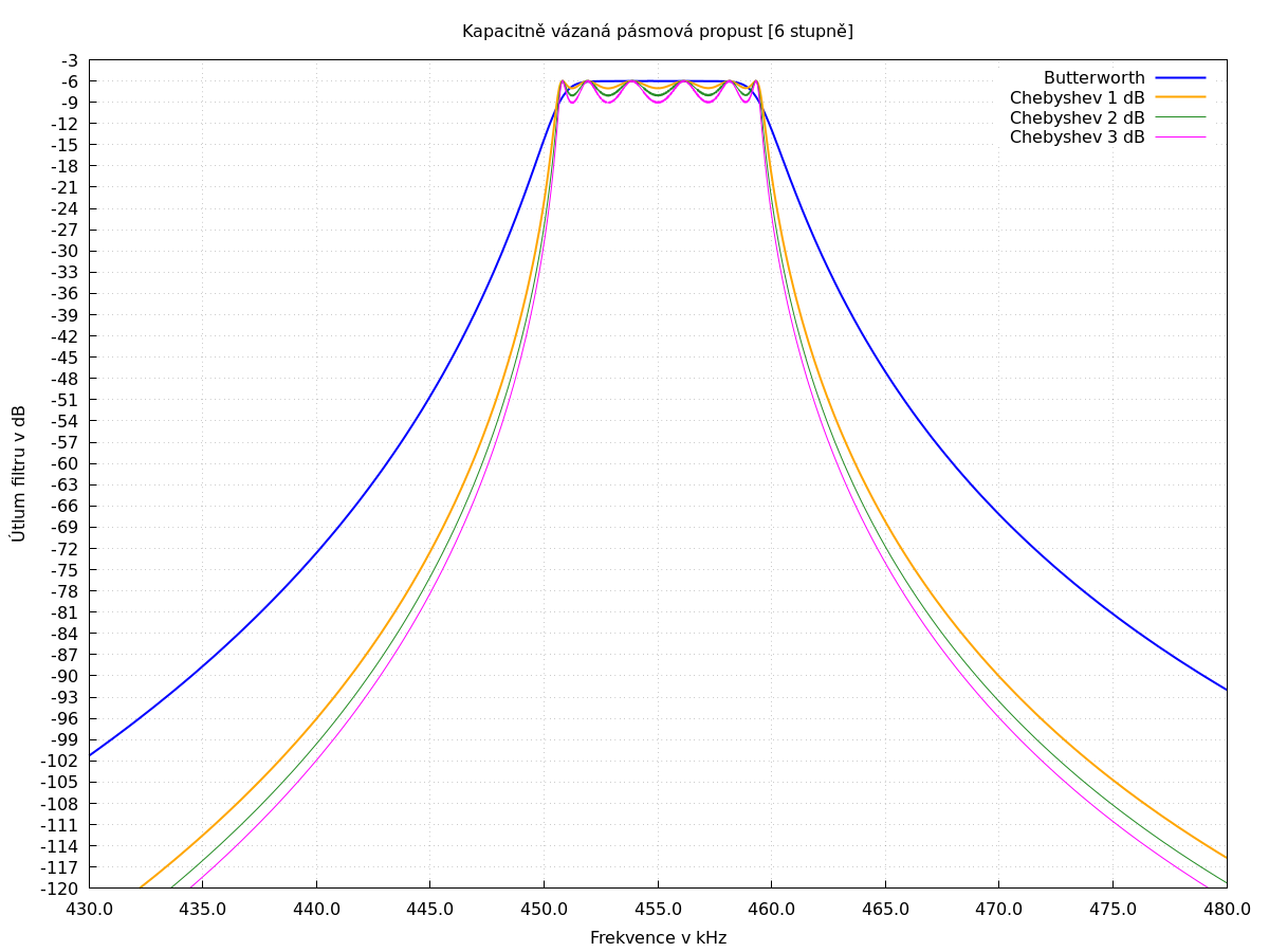 V příloze je frekvenční průběh pásmové propusti 6 stupně pro různé povolené zvlnění.