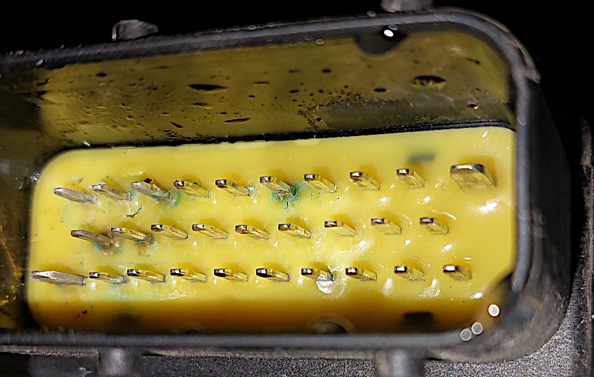 3) konektor kabelu do ŘJ dveří je skutečně uvnitř na jedné straně zelený (viz moje podezření vyjádřené výše), i když protikus na jednotce (nože) se zdá být OK. Viz taky fotky v příloze. Z hlediska umístění (z konektoru jdou kabely šikmo dolů) bych ale očekával, že někde v tělese konektoru na přechodu dutinka - lanko může být docela humáč, až rozpad, protože právě tam mohla zatékat voda. Takže to bude další věc, která půjde na podrobnou analýzu.