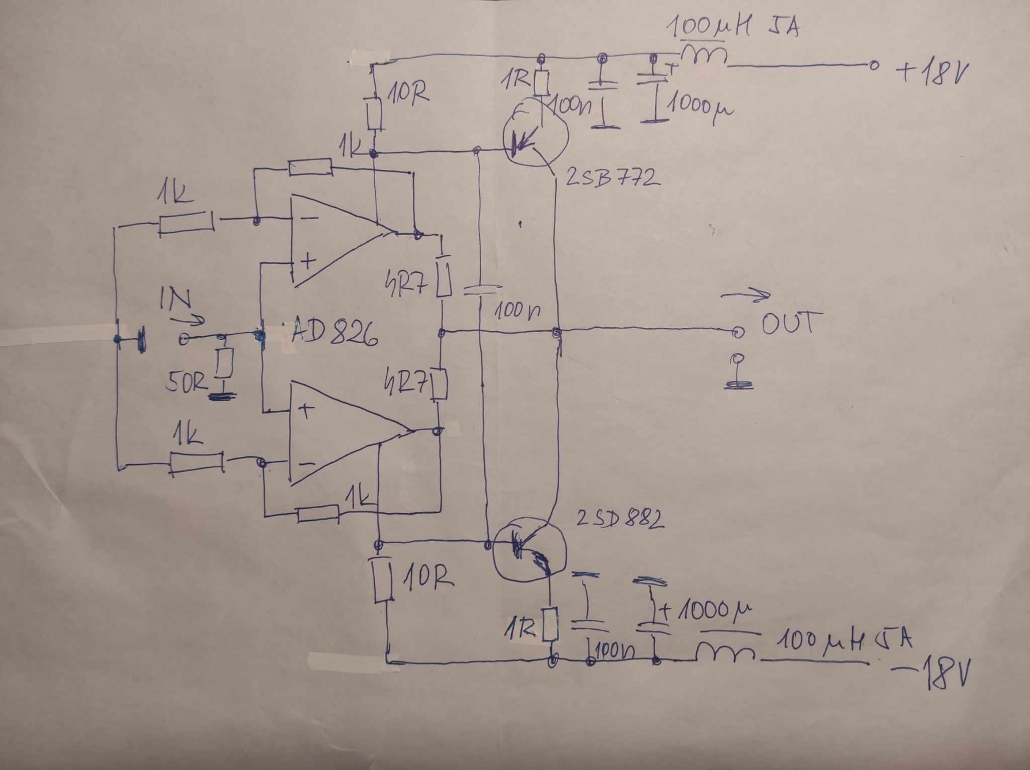 AD826 v DIP8 pouzdře, oba operáky poralelně + 2SD882 a 2SB772, něco takovýho a odpor 1K zmenšit a druhej zvětšit, teď to má zesílení 2.