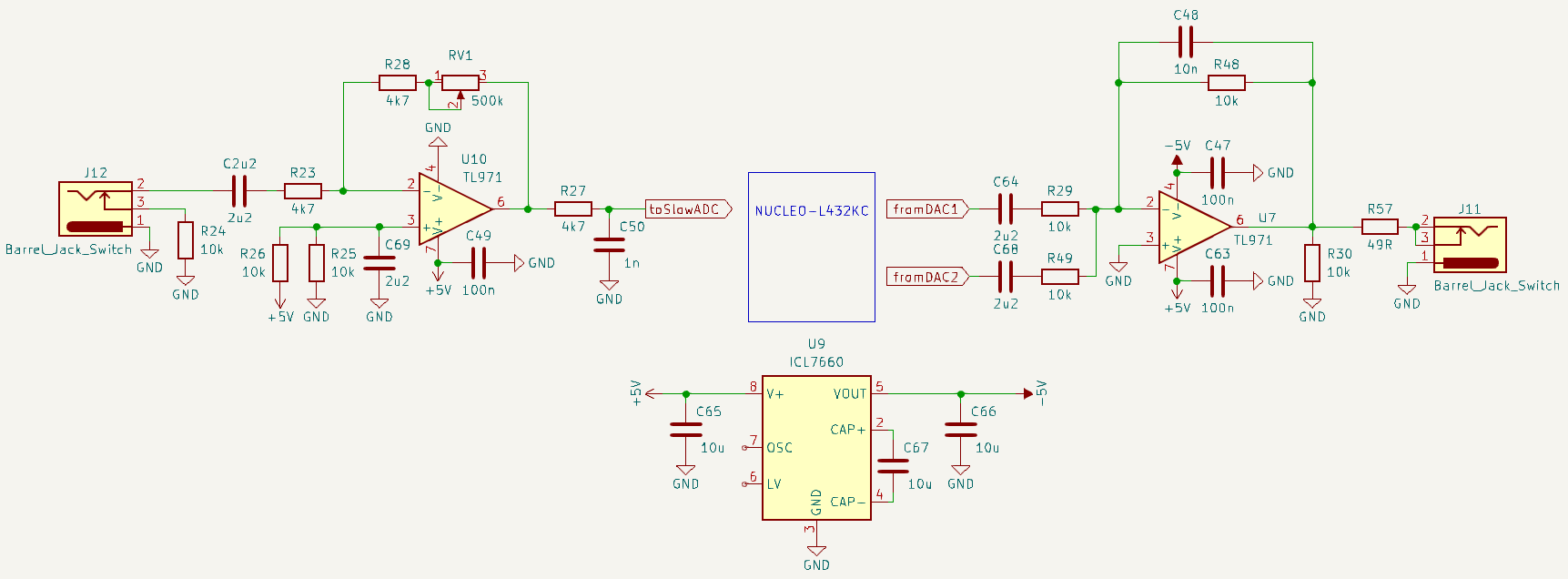 A aby to k něčemu bylo, tak přikládám schéma, jak by to mohlo vypadat, kdyby jsi nechtěl jen hračku na programování, ale kytarový efekt... Ta procesorová deska NUCLEO-L432KC má stejné rozměry a piny jako to Arduino Nano. Má dva DAC kanály a dá se programovat v Arduino IDE. Navíc je to rychlé, a klidně můžeš počítat i s plovoucí desetinnou čárkou. Má to hromadu paměti, tak si můžeš ukládat jednotlivé efekty. DAC je tuším jen ∑-Δ, ale pořád úplně jiné kafé než tvůj napěťový dělič nebo filtrované PWM...
